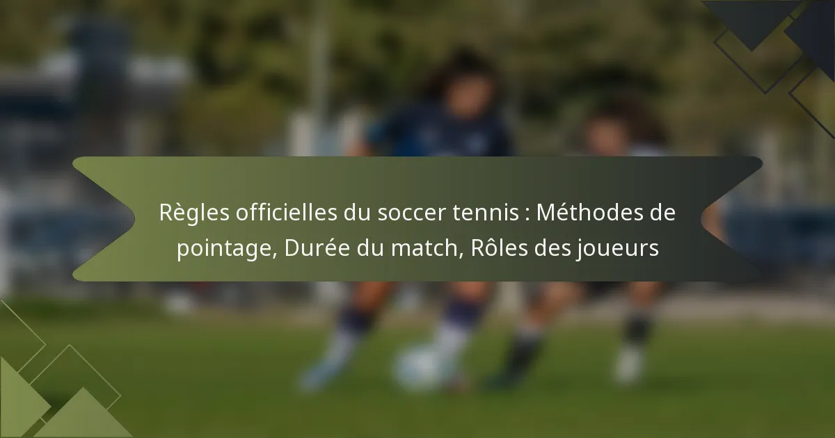 Le soccer tennis combine des éléments de soccer et de tennis, utilisant un système de points où les joueurs ou les équipes marquent en remportant des échanges. Les matchs peuvent se jouer en simple ou en double, durant généralement entre 30 et 60 minutes, et impliquent des règles de score spécifiques. Les rôles des joueurs sont essentiels, chaque participant ayant des responsabilités définies qui impactent la stratégie et la performance globale de l’équipe.